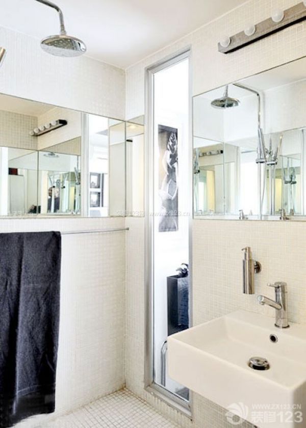二、利用鏡面反射原理,小衛浴也可以顯得十分寬敞。首當其沖的就是梳妝鏡,在此范例中,梳妝鏡采用大面積覆蓋,鏡子的寬度就是墻面的寬度,同時在側面墻上也同樣能采用了鏡面,在雙面鏡子的反射下,房間空間立刻產生Double效果,衛浴空間視覺上擴大了一倍。