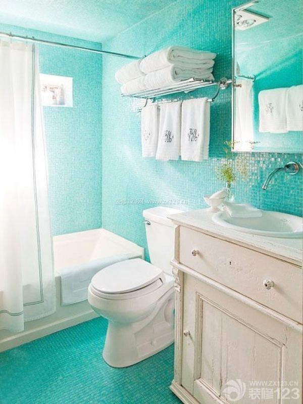 三、清爽的色彩總是能提升空間的亮麗度。狹長的衛浴空間放下座便器以及小巧的臺盆剛剛好,一邊攔出一個小空間,掛上簾子就是淋浴區了。墻角的空間完美的劃分成了淋浴區,一旁放置的收納柜以及墻上的收納架都很好的將小空間利用了起來。