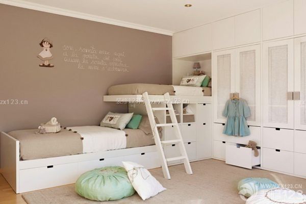 以最簡單的格局呈現(xiàn)出雙人兒童房空間,簡單的咖啡色墻面上貼著英語字母墻貼,一看就知道住在這里的寶寶處于一個(gè)學(xué)習(xí)的階段。窗戶的光線正好曬滿整個(gè)房間,配上白色的家具,整間房里有種讓人感覺明亮開朗的感覺。