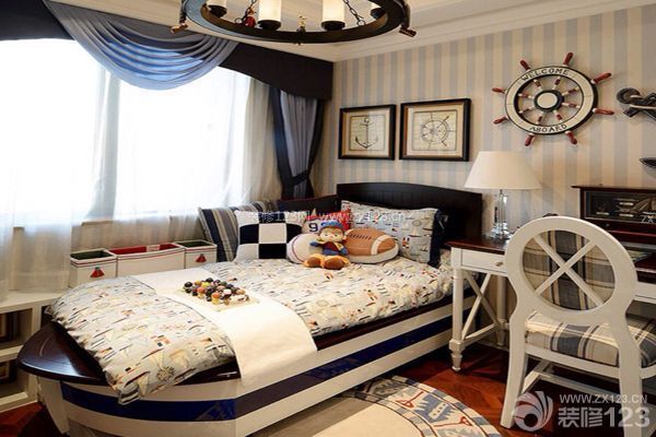 以海洋世界作為兒童房的主題,白色與淡藍(lán)色寬形豎線條的墻面上貼上海底生物的墻貼,掛上一個(gè)掌控方向的船舵,一個(gè)深藍(lán)色航船型的床,仿佛就能看到無邊無際的大海,小魚在其中穿梭的情境。從墻上的擱板到窗臺(tái)處都運(yùn)用了符合海洋主題的波浪形擱板,淡藍(lán)與深藍(lán)相間的窗簾更是融入了整個(gè)主題中。