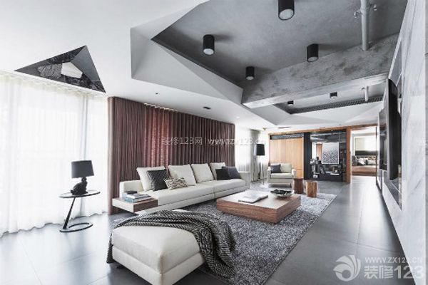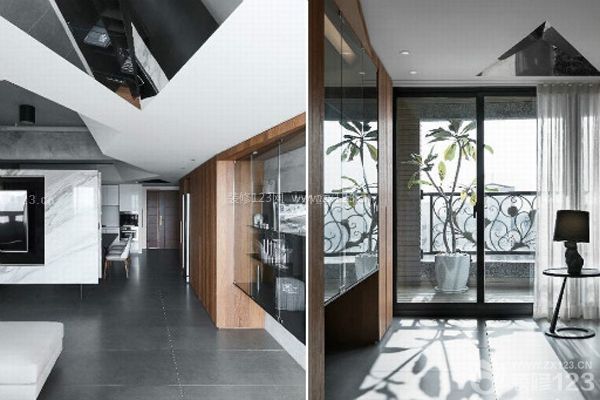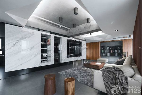 挖空的天花裸露出水泥粉光的粗糙質感,結合白色噴漆的立體幾何折線造型,除了隱藏設備管路外,也藉由天花的高低差演繹空間即是生活容器的意象。
