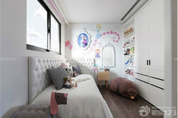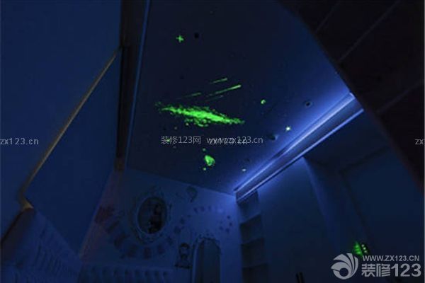 墻面呈現深受小孩喜愛的童話意境,天花板以夜光星河圖案點綴,帶來夢幻和趣味,同時考慮屋主訓練小孩生活自主的需求,也將衣櫥的抽屜和吊衣桿分別以滑動式和下拉式的方式呈現。