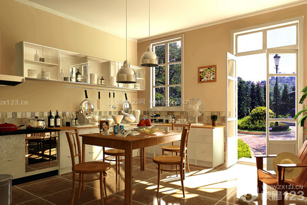 所謂“通透”,是指廚房與餐廳合并。這種情況就餐時上菜快速簡便,能充分利用空間,較為實用。只是需要注意不能使廚房的烹飪活動受到干擾,也不能破壞進餐的氣氛。最好要盡量使廚房和餐廳有自然的隔斷或使餐桌布置遠離廚具,餐桌上方的照明燈具應該突出一種隱形的分隔感。