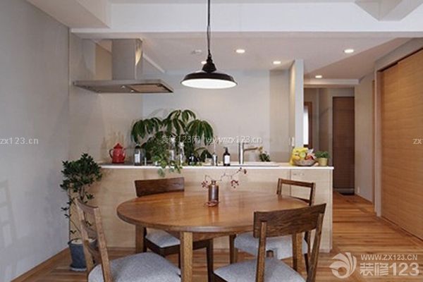 開放式的廚房,將實用美觀的餐桌緊密相連,加強了家人間的溝通與交流。圓形的木質餐桌,實木的自然高貴,顯得純樸優雅。灰色坐墊的餐椅,盡顯舒適之感。