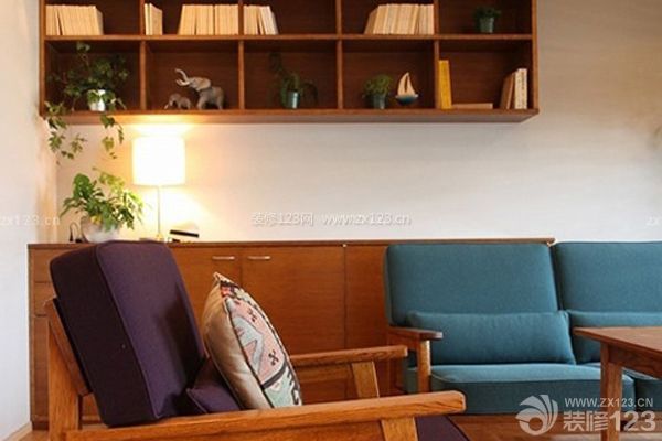 藍色和紫色坐墊的木椅,彰顯出高貴優雅的氣質。懸空式的網格收納柜,可以擺放上家中的以及裝飾品等,使得空間更富有情調。