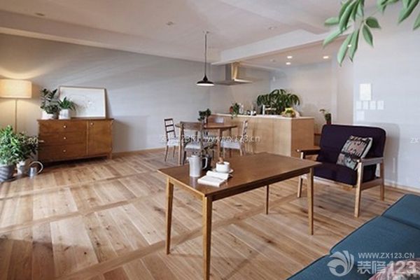 木質的地板與木質的家具相搭配,整體顯得非常協調。長方形的木質茶幾,展示出濃郁的日式恬淡。幾株綠色植物,帶來了一抹大自然的氣息。