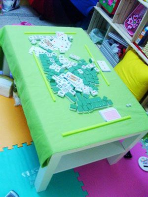 把茶幾上的東西一拿,攤上布還有偶們的麻將~~哇啦啦!麻將桌來啦~!