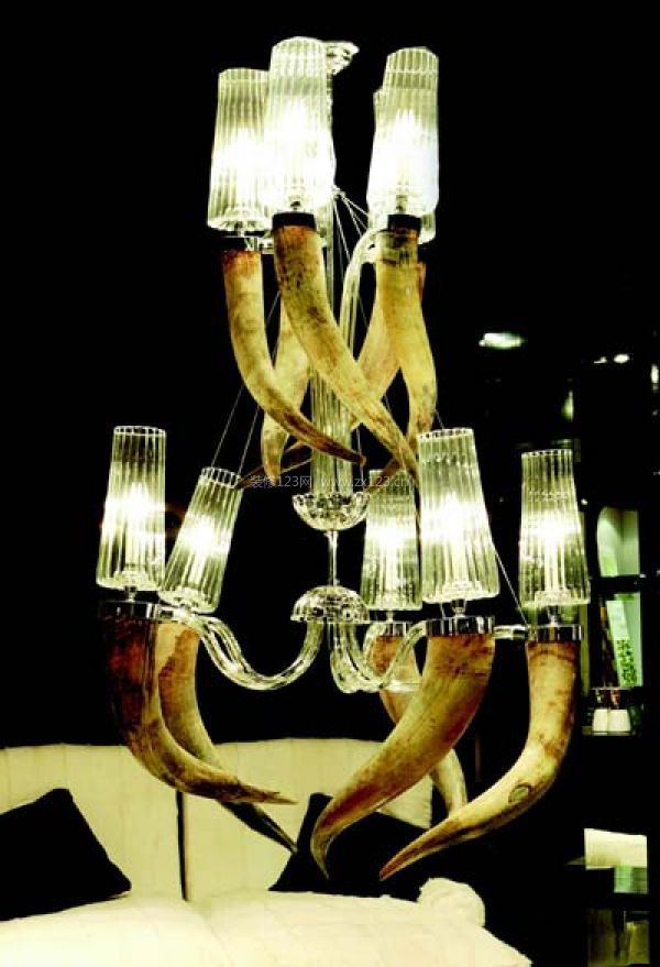 黑色的牛角吊燈有未來主義的特征,追求挺直的幾何造型及光滑的流線形式,同時又簡潔明快,酷酷的感覺是哥特一族的最愛。燈體為紅色的軟塑料材質,均衡地折彎而成,柔和的白色巧克力底座中和了熱烈感,使氛圍轉變為火樹銀花般的甜蜜。白色羽毛通過多層次的連接制造出流蘇般的效果,整體感覺溫馨浪漫,既自然又具有很強的裝飾功能。