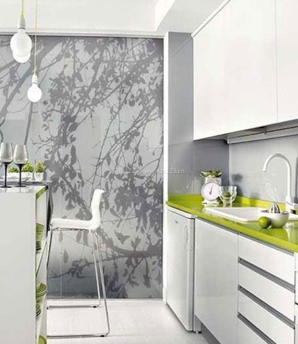 植物造型的隔斷玻璃搭配主題的翠綠色,自然氣息便更加濃郁了。廚房里有好幾個收納柜,可以容納很多料理工具,旁邊內嵌式的迷你小冰箱,新鮮的食材都靠它來保存,也給了小戶型更多的視覺空間。 四面一體的純白色模塊將清新風格小戶型的簡美哲學發揮得淋漓盡致。