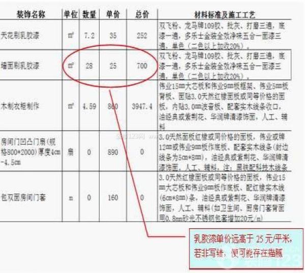 以下圖為例,紅框標出的部分明確提示,一些細節的地方是最容易被我們忽略的,在審核裝修預算清單的時候要從多個方面考慮,如果裝修公司出的報價跟市場上的平均價格存在很大出入的話,要及時提出更改。