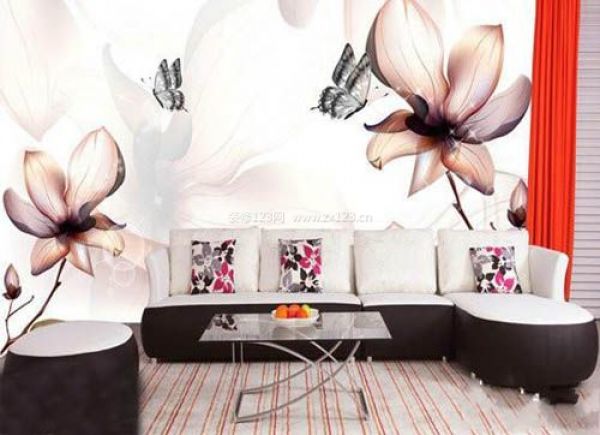 沙發(fā)背景墻的裝飾注重和沙發(fā)乃至客廳整體的搭配。這個沙發(fā)背景墻選用了和靠墊相似的圖案,使這個客廳在風格得到了很好的統(tǒng)一。大朵的花朵圖案,和翩翩飛舞的蝴蝶,更是營造了花的世界。
