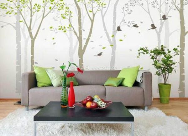 灰色搭配綠色的秋季氣息彩繪沙發(fā)背景墻