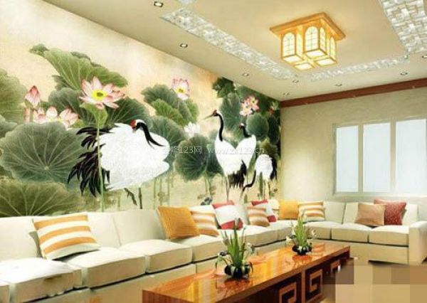 中式風格的茶幾、別致的吊燈,而選用了仙鶴,蓮花的沙發(fā)背景墻,很好地融合了這個客廳的風格,將濃郁的中國味道極好的展現了出來。