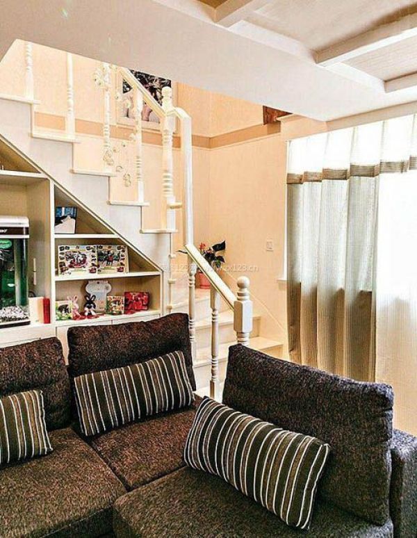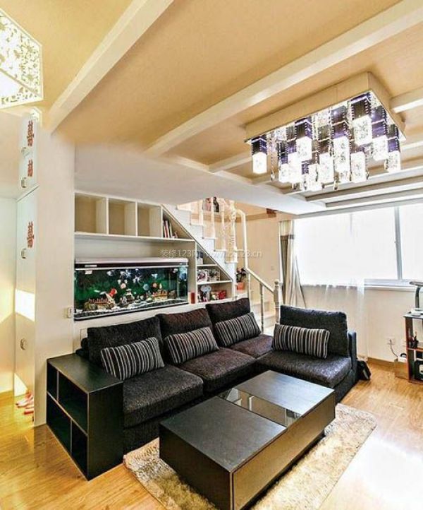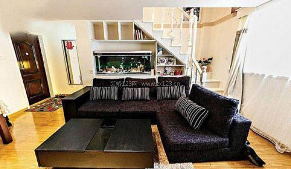 客廳黑色的沙發和茶幾,樓梯間改造成儲物柜,還擺放了魚缸裝飾。