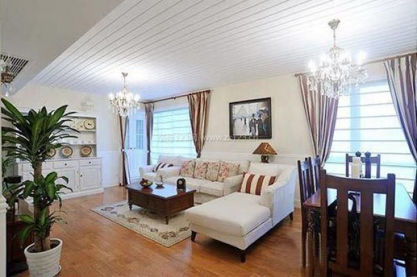 棕色和白色搭配的客廳,顯得優雅時尚,實木家具的運用讓客廳更顯復古。白色布藝轉角沙發配上甜美清新的抱枕,彰顯出法式浪漫情調。白色的墻面與淺棕色地板搭配,加上兩盞壁燈及水晶吊燈更能突顯出浪漫的情調。樹木的裝飾,更讓人仿佛置身香榭麗舍大道的感覺。