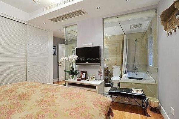 主臥與衛生間相連的地方用透明玻璃隔斷,讓空間看起來更加寬敞,中間一小塊墻面被巧妙利用作為電視背景墻。