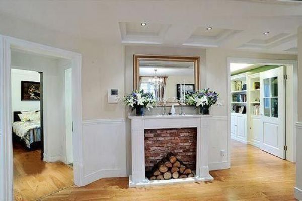 走廊的裝飾壁爐用質樸的紅磚和木柴堆打造出浪漫的情懷,擺上一些花卉和燭臺,代替了玄關柜的裝飾效果。從走廊也可以看出實木復合地板延伸到了各個房間,使得整個空間的色彩都圍繞著白墻與木地板展開。