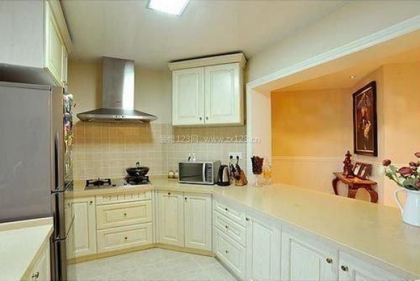 開放式廚房用雪白色的櫥柜和米色墻磚打造出整潔優雅的效果,由于廚房異型結構,櫥柜的規劃設計便更加重要,比方轉角部分作為微波爐區域,靠走廊部分作為開放式吧臺,都是利用了廚房自身的結構。