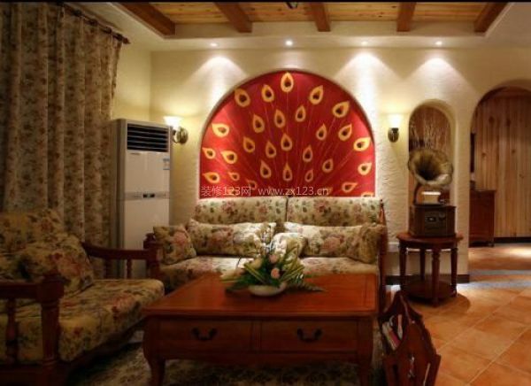采用碎花布藝沙發(fā)和窗簾點綴出整個客廳的溫馨感,沙發(fā)背景墻采用紅色孔雀開屏圖案設(shè)計,在柔和的燈光照射下,不僅能瞬間吸引人們的目光,而且更能將地中海風格的質(zhì)感與柔美展露無遺,從而使客廳的整體氣質(zhì)得到極大提升。