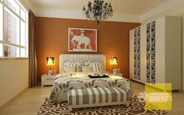 臥室整個空間以淡雅的素色為主,床頭背景墻橘色的墻漆,及顏色跳躍的掛畫,增強了整個空間的溫馨與立體感。