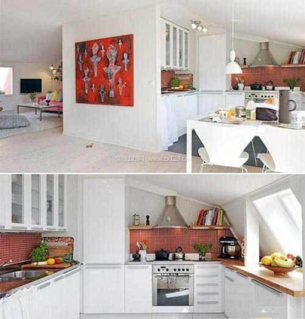 一幅紅色搶眼的現(xiàn)代主義抽象畫裝飾著白色的墻面,豐富了自上而下都只有白色的單調(diào)空間。紅色馬賽克瓷磚拼貼出貫穿廚房的中軸紐帶,U型廚柜組合擴(kuò)大了廚房內(nèi)的活動空間。