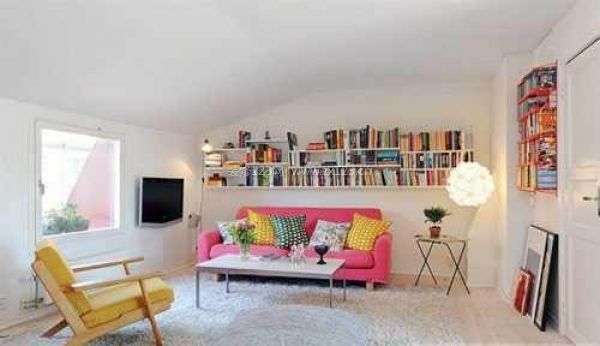 客廳里墻面與地面都繼續(xù)沿用白色,潔凈純白的國度里五彩的軟裝飾點亮空間。粉紅色的沙發(fā)配以圓點抱枕,顯得俏皮可愛。