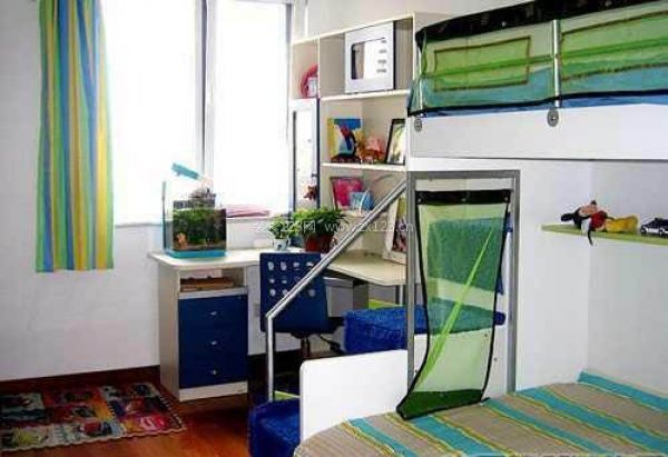 海軍風格兒童房簡單實用,童房是個孕育孩子夢想的地方,當然要裝扮得清新而夢幻,藍色的海軍風格正好是個給孩子夢想護航的好選擇。為了節省空間,兒童房里安置了一張上下兒童床,以及在靠窗的轉角位置放了一張書桌臺,色彩則以藍色和綠色為主,營造出自然而清爽的海軍風情。