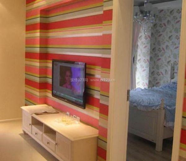 電視墻的墻紙我顏色選得大膽。哈哈。適合女生吧。單拍的電視墻。電視柜是田園風(fēng)格的。