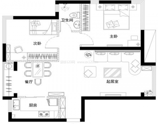 這張房間的平面設計圖提供的信息十分簡陋,除了可以看到該80平米二居室的每個功能區的分布空間,和每個空間的家居布置,甚至連每個房間的數值信息,家具實用材料等等信息完全 沒有標注。