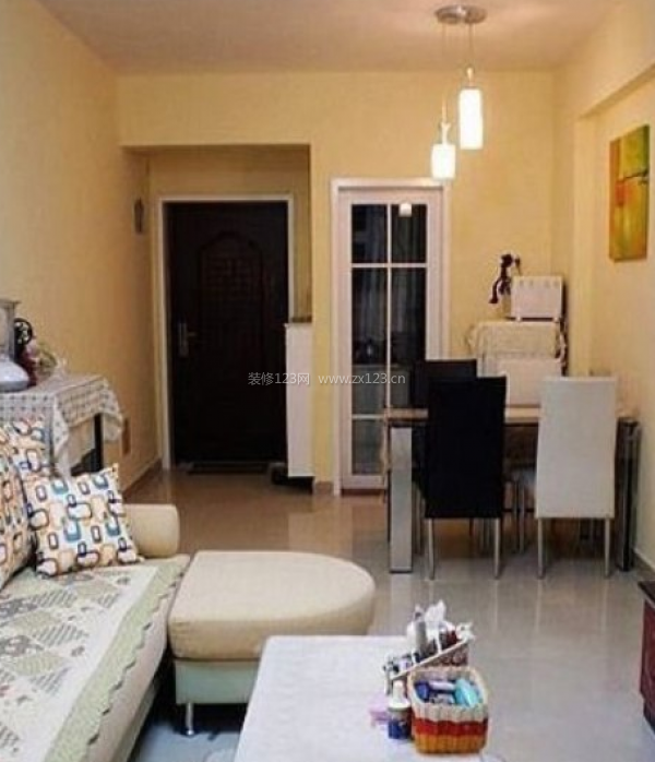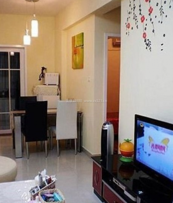 這個角度可以看見電視背景墻上方的手繪小花,燃空間顯得十分生動有活波。餐廳上的吊燈是業(yè)主自己買的。而簡易的餐桌能夠容納一家人,微小的餐桌不但能保證基本的功用,還拉近一家人的距離。