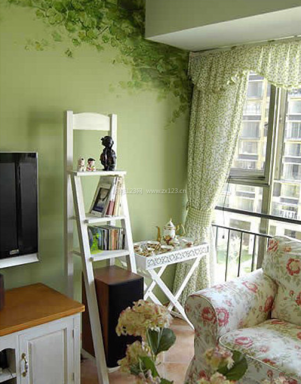 電視背景墻采用綠色粉刷。角落手繪長春藤葉子,翠綠的顏色不但能放松人的眼球,還產(chǎn)生仿佛家居在田田藤葉之中。半人高的隔斷,開放的空間產(chǎn)生空曠的視覺感。拱形的墻壁隔斷增加了客廳餐廳一體空間的連同視覺高點。