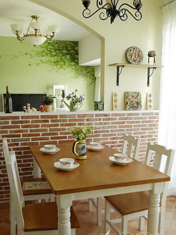 客廳餐廳一體空間的吊燈都采用富于線條變化的歐式吊燈。餐廳和客廳的間隔還能夠防止酒品和植物盆栽。仿造農(nóng)村后土切成的隔斷才充滿田園風味。