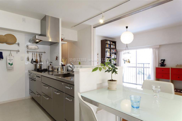 開(kāi)放式廚房設(shè)計(jì),餐廳和廚房同在一個(gè)分隔區(qū)間。金屬的材料有利于廚房清潔。綠色的植物盆栽有畫(huà)龍點(diǎn)睛的裝飾效果。