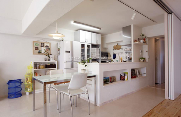 天花的橫梁,加上手推門和瓷磚顏色的不同,成功的將餐廳和客廳進(jìn)行開(kāi)放性分隔。吧臺(tái)式的餐桌設(shè)計(jì)顯得十分時(shí)尚。凹陷部分的空間,正好可以擺放雜志等休閑書(shū)籍。