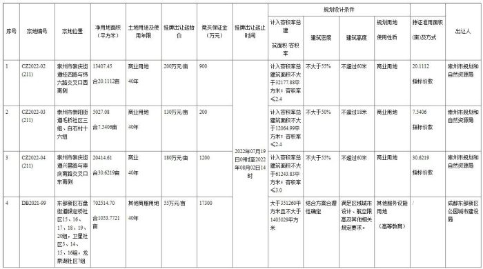 據出讓公告顯示,有3宗地塊位于崇州市,均為商業用地。另一宗地塊位于1位于東部新區位于東部新區石盤街道銀定橋社區15、16、17、18、19、20組,衛星社區3、14、15、16組,龍泉湖社區7組,為高等教育用地,計容建面大于351260平方米且不大于1405029平方米,出讓起始價55萬元/畝。