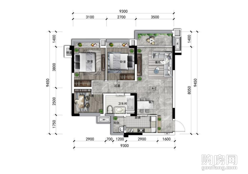 A2戶型(3室2廳,88.7平,南北)