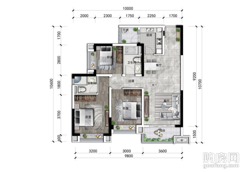 A1戶型(3室2廳,104.6平,南北)