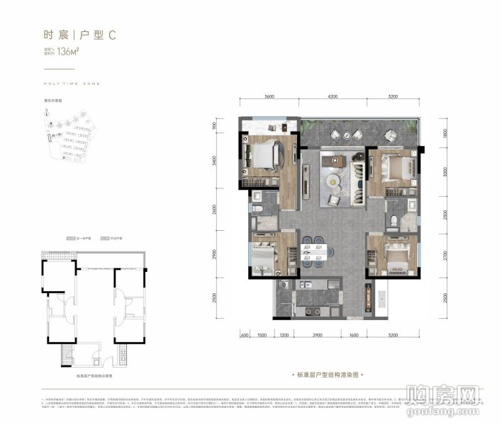 【戶型C】:4室2廳,朝向為南,建面約138㎡,參考單價約20000/㎡