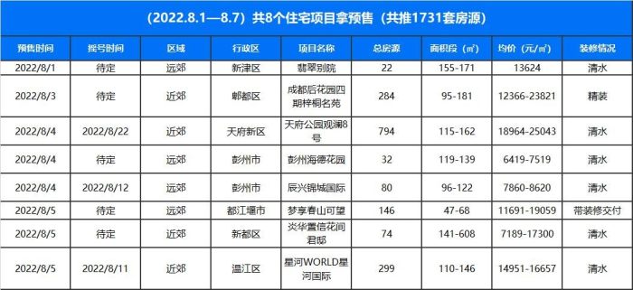 據有關數據顯示,成都8.18.7共有8個住宅項目獲取預售,分別為翡翠別院、成都后花園四期梓桐名苑、天府公園觀瀾8號、彭州海德花園、辰興錦城國際、夢享春山可望、炎華置信·花間君邸、星河WORLD星河國際,共計11731套房源,環比上漲13%,其中近郊4個項目共1451套,遠郊4個項目共280套。