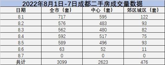 據(jù)數(shù)據(jù)顯示,2022年8月1日7日,成都二手房成交量共計(jì)為3099套,中心區(qū)域?yàn)?623套,郊區(qū)城區(qū)為476套。