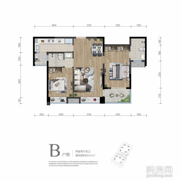 2室2廳2衛(wèi),B戶型(2室2廳,101平,南)