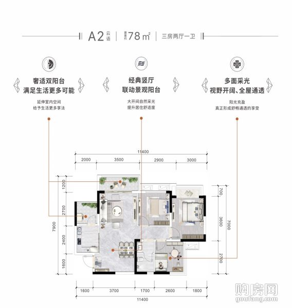 環天時代中心二期A2戶型(3室2廳,78平,南北)