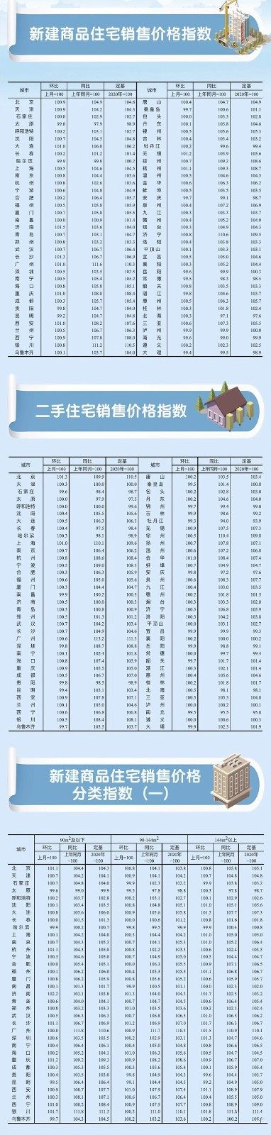 二、各線城市商品住宅銷售價格同比漲幅穩中趨落。據測算,6月份,一線城市新建商品住宅銷售價格同比上漲6.1%,漲幅比上月微擴0.1個百分點;二手住宅銷售價格同比上漲10.5%,漲幅比上月回落0.3個百分點。二三線城市新建商品住宅銷售價格同比分別上漲4.8%和3.7%,漲幅比上月分別回落0.2和0.1個百分點;二手住宅銷售價格同比分別上漲3.5%和2.6%,漲幅均與上月相同。